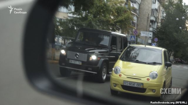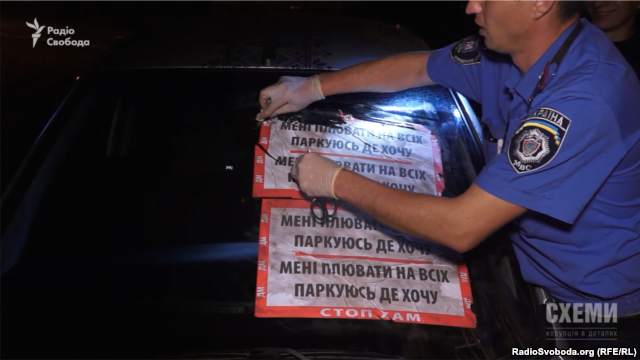 Далі охоронці олігарха йдуть повз автомобіль знімальної групи з ось такими наклейками.