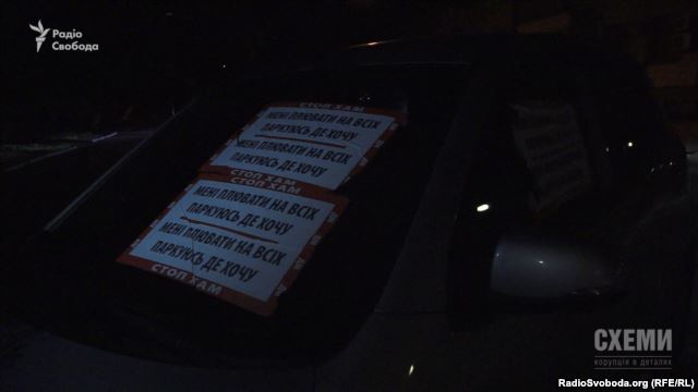 Коли наступного разу журанлісти підійшли до авто, то там уже чекала неприємна несподіванка. Лобове і бокове скло було заклеєне саме тими наклейками, які були у руках охоронця олігарха Коломойського.