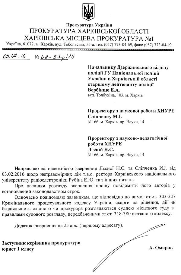 Проведенный в конце прошлого года внешний аудит ХНУРЭ показал многие схемы разворовывания университета. Омаров впаривал в столовые свои гнилые продукты по заоблачным ценам. Проректор Слипченко обналичивал и выводил в собственный карман бюджетные деньги, выделяемые на науку. Под его же «чутким руководством» пропало более полутысячи патентов университета. А с помощью Омарова они теперь , вполне вероятно, приносят пользу российской военщине – разработки украинских ученых используются для убийства украинцев. Наталья Лесная была и.о. ректора, когда все это происходило.