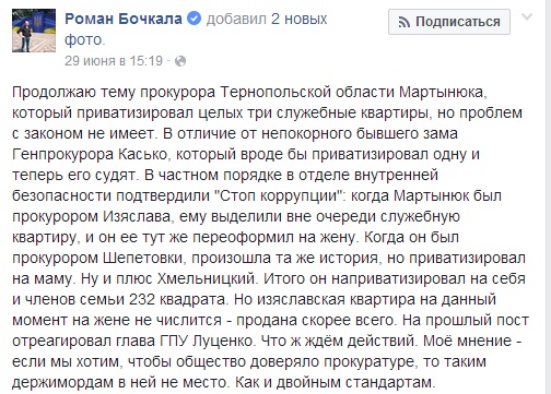 Квартирная эпопея же бывшего Тернопольского облпрокурора гораздо обширнее. В частности, журналист Роман Бочкала в своем Fb сообщал, что за годы работы в органах прокуратуры Мартынюк якобы получил от государства сразу 3 квартиры. "Когда был прокурором Изяслава, ему выделили вне очереди служебную квартиру, и он ее тут же переоформил на жену. Когда он был прокурором Шепетовки, произошла та же история, но приватизировал на маму. Ну и плюс Хмельницкий. Итого он наприватизировал на себя и членов семьи 232 квадрата. Но изяславская квартира на данный момент на жене не числится - продана скорее всего", - утверждал Бочкала со ссылкой на анонимный источник.