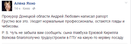 Бывший прокурор Донецкой области Андрей Любович написал рапорт об отставке. Об этом в Facebook сообщила экс-спикер киевской прокуратуры Алена Яхно. "Прокурор Донецкой области Андрей Любович написал рапорт. Грустно все это. Уходят нормальные профессионалы, остаются говды и чибисовы", - написала Яхно.