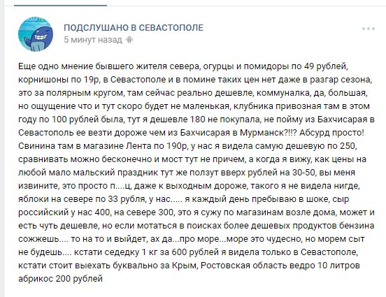 7) Приехали гости из Мурманска. В шоке от наших цен на фрукты. В мире что-то сломалось! Фрукты дешевле в Мурманске. В МУРМАНСКЕ!!! (прим. Дошло даже до того, что руссо-туристо ходит к местным пропагандистам и жалуется на цены, которые выросли троекратно, если сравнить хотя бы с 2015 годом.