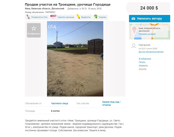 В то же время с 10 июля на OLX.ua на Свято-Георгиевской продают участок площадью в шесть соток для садоводчества. Его стоимость – 24 тысячи долларов (4 тысячи долларов за сотку). "На улице есть электричество, рядом школа, городской транспорт и река Десенка", - указано в объявлении.