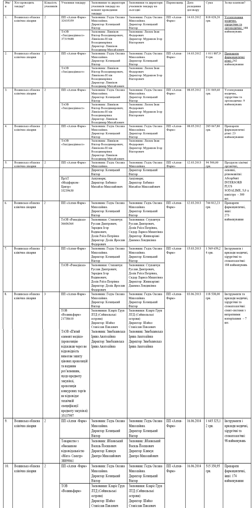 У цієї фірми купували все – від лікарських засобів до медичного устаткування. Цікаво те, що згідно з інформацією з «Вісника державних закупівель» ця компанія перемагала на тендерах лише у Волинській обласній клінічній лікарні.