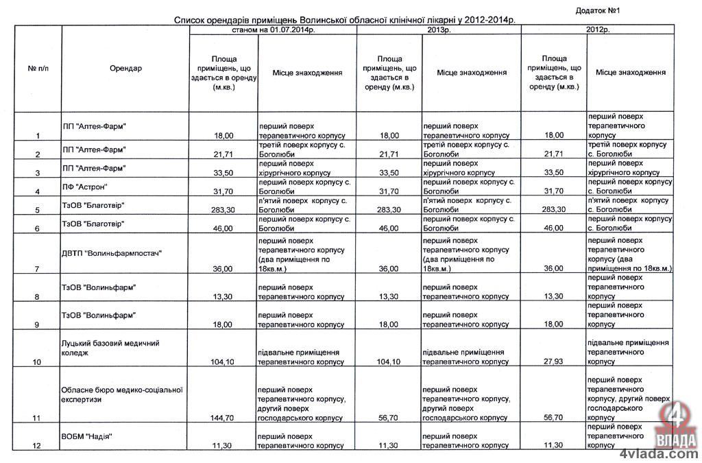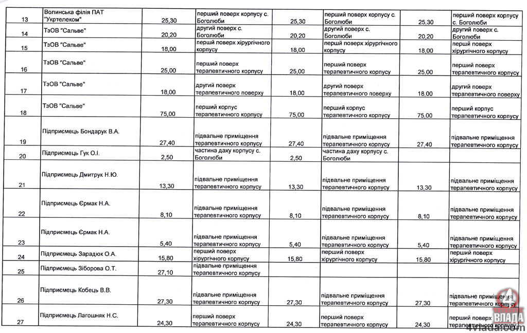 Орендарі приміщень в обласній лікарні (щоб збільшити натисніть мишкою):
