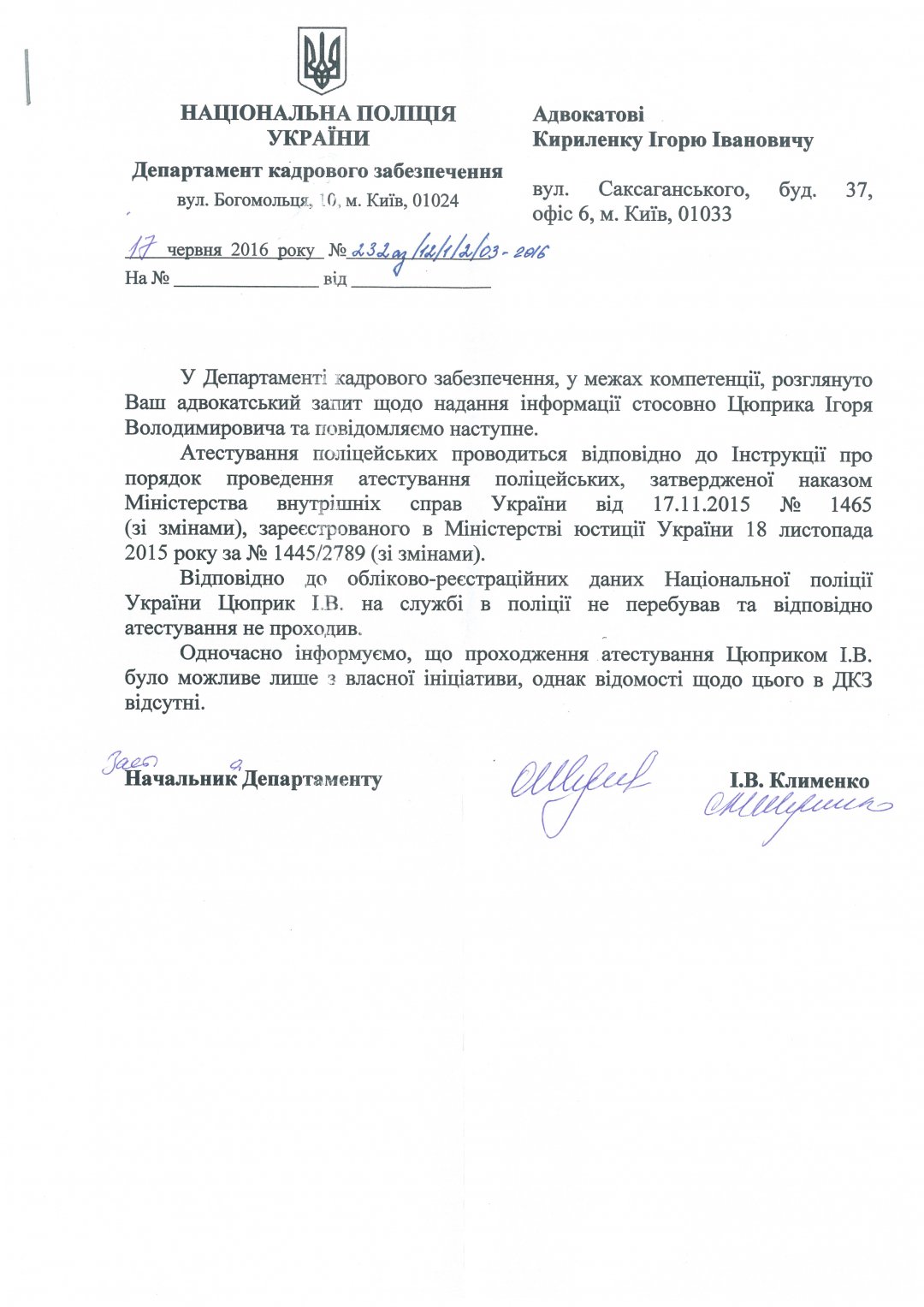 За словами адвоката, в Нацполіції на його запит відповіли, що Цюприк Ігор Володимирович у них на службі не був і, відповідно, атестацію не проходив.