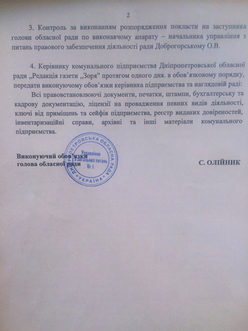 «Назначить Писоцкого Владимира Анатольевича временно исполняющим обязанности руководителя коммунального предприятия Днепропетровского областного совета «Редакция газеты «Зоря» 02 августа 2016 года на период отстранения Зайцевой Ксении Георгиевны», – говорится в «документе», опубликованном на сайте.