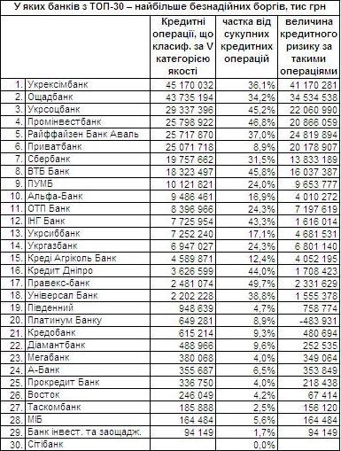 Зі статистики НБУ на 01.07.2016 випливає, що в абсолютному вимірі (сума) серед ТОП-30 банків за обсягом активів найбільше кредитів V категорії якості (безнадійні, прострочка понад 90 днів) було в Укрексімбанку (45,2 млрд грн), Ощадбанку (43,7 млрд рн), Укрсоцбанку/UniCredit Bank (29,3 млрд грн), Промінвестбанку (25,8 млрд грн) та «Райффайзен Банку Аваль» (25,7 млрд грн) - див. нижче таблицю.