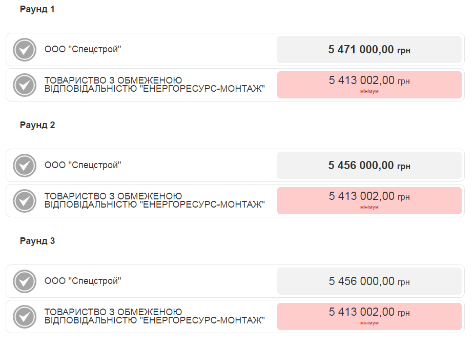 В аукционе по реконструкции теплосетей на Сегедской улице участвовала всего две компании: «Энергоресурс-монтаж» (Львов) и «Спецстрой» (Винница). Размер минимального снижения цены составлял всего семь тысяч гривен. Львовская фирма сразу установила цену в 9,42 млн. гривен и в дальнейшем не изменяла ее, а вот винничане повели себя достаточно странно. Первоначально они запросили 9,49 млн. гривен, а позже дважды понижали сумму на семь тысяч гривен. Разница ценовых предложений между победителем и програвшим составила всего 54 тыс. гривен!