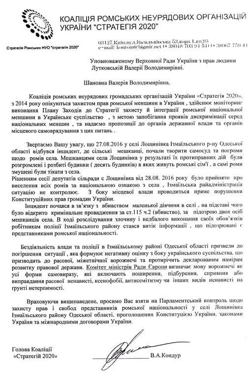 Глава Коалиции ромских неправительственных организаций Украины "Стратегия 2020" Владимир Кондур отправил министру внутренних дел Арсену Авакову и уполномоченному Верховной Рады Украины Валерии Лутковской обращения по поводу событий в Лощиновке Одесской области.