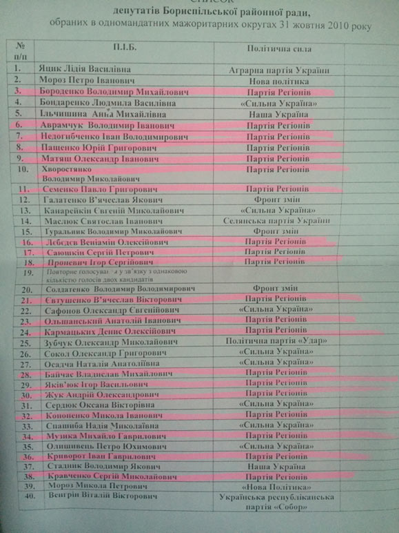 Еще фамилии из этого списка: Недогибченко Иван, Байчас Владислав, Байчас Сергей, Аврамчук Владимир, Матяш Александр, Музыка Михаил, Евтушенко Вячеслав, Солдатенко Владимир (был помощником Мищенко), Кононенко Николай, Жук Андрей, Хворостянко Владимир и другие «товарищи». При этом «шайка товарищей» зачистила сайт Бориспольского районного совета: сегодня там нет сведений о составе фракции Партии Регионов времен В. Януковича. Но зато этот список сохранился на бумажном «носителе»: