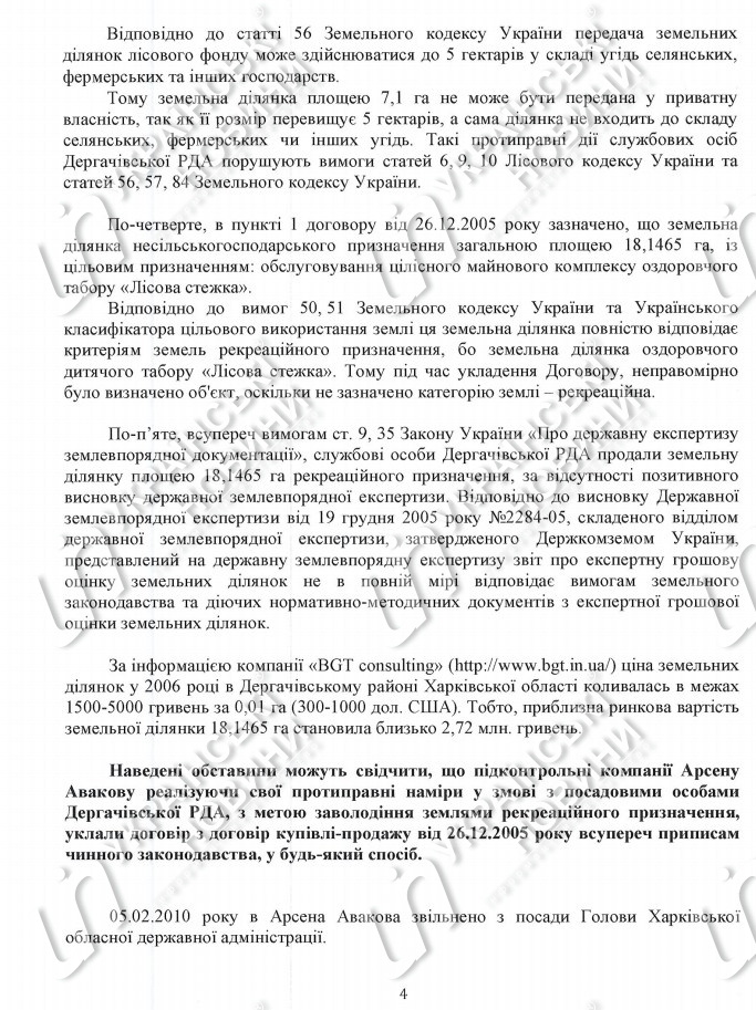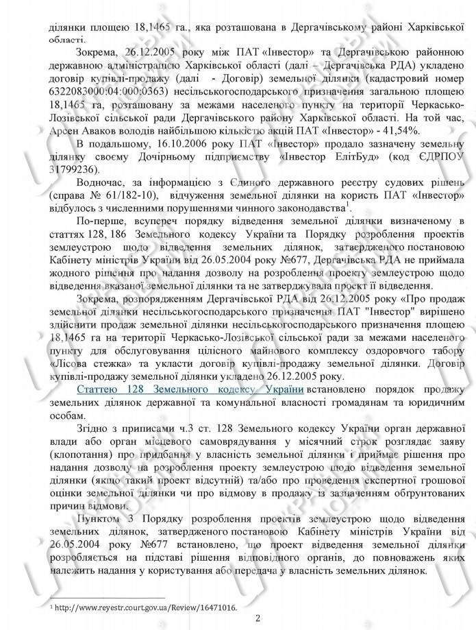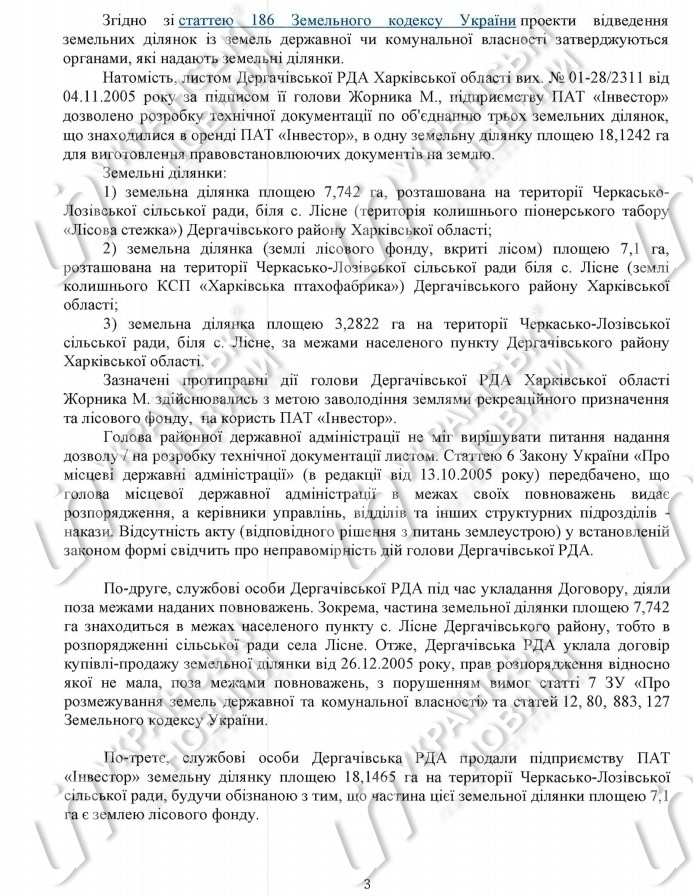 Согласно тексту обращения "Центра противодействия коррупции", в 2005 году ПАТ "Инвестор" и Дергачевская райадминистрация заключили договор купли-продажи земельного участка площадью 18,14 га, размещенному за пределами населенного пункта на территории Черкасско-Лозовского сельсовета. На самом деле, участок состоял из трех земельных наделов, на террит ории одного из которых находился детский лагерь, второй был отнесен к землям лесного фонда, а третий принадлежал Черкаско-Лозовскому сельсовету и не мог быть отчужден райадминистрацией.