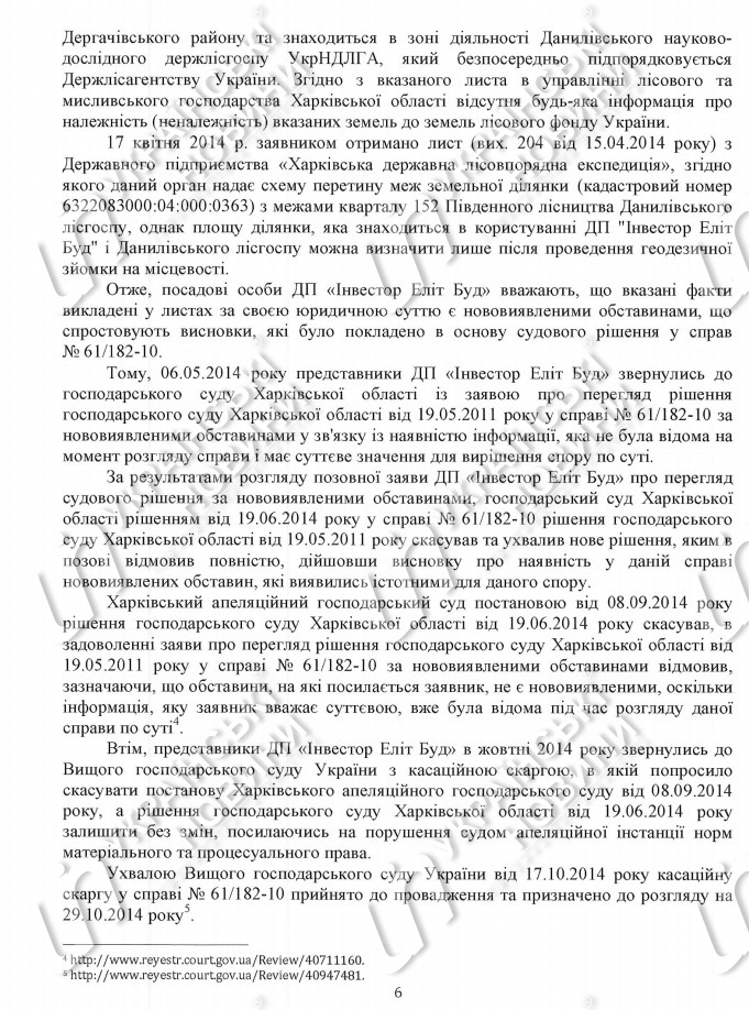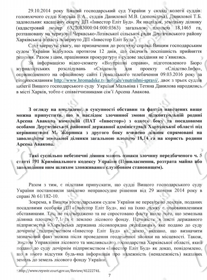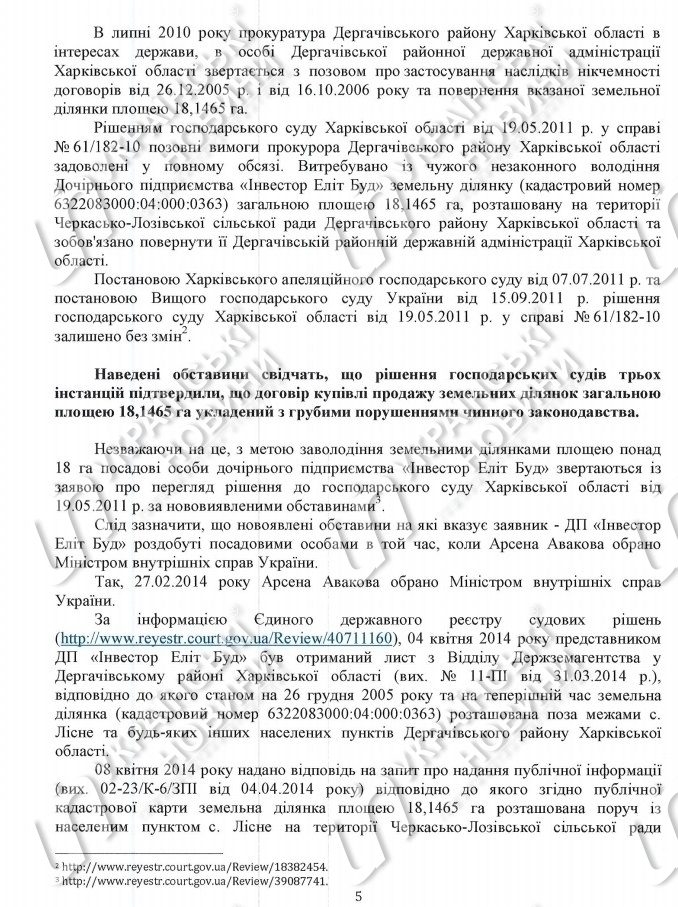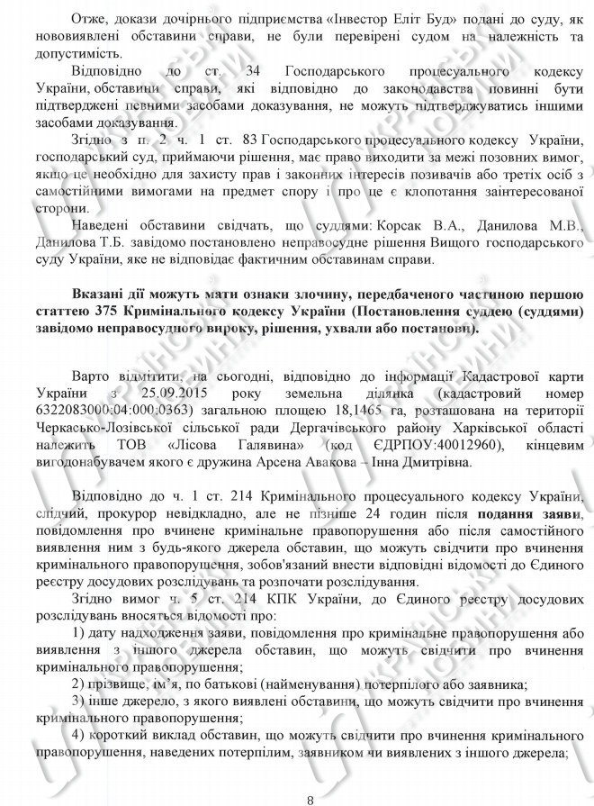 Таким образом, по мнению "Центра противодействия коррупции", судьи Высшего хозсуда постановили заведомо неправосудное решение, а чиновники Дергачевской райадминистрации в сговоре с компаниями, подконтрольными семье Авакова, незаконно завладели 18,14 га земли.