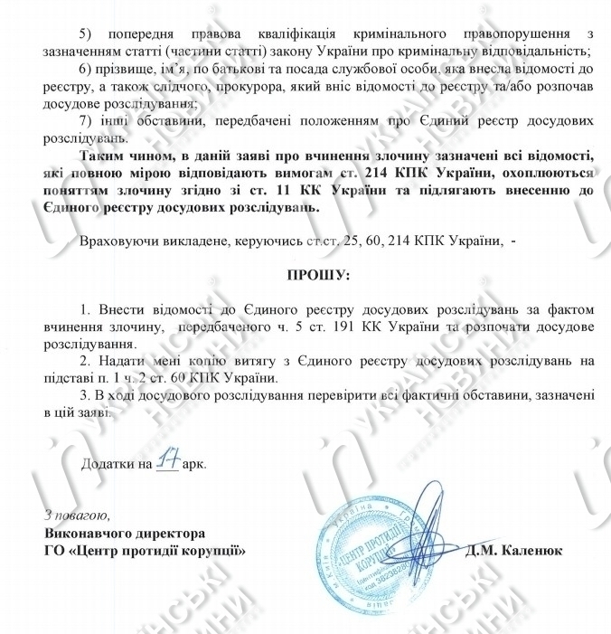 Уголовное производства открыто по статье 364 Уголовного кодекса (злоупотребление властью или служебным положением) Уголовного кодекса по обращению общественной организации "Центр противодействия коррупции".
