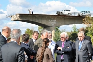 В социальных сетях большой резонанс вызвала фотография главы Министерства иностранных дел Германии Франка-Вальтера Штайнмайера в зоне АТО на фоне разрушенного моста с надписью: "Тут был русский мир".