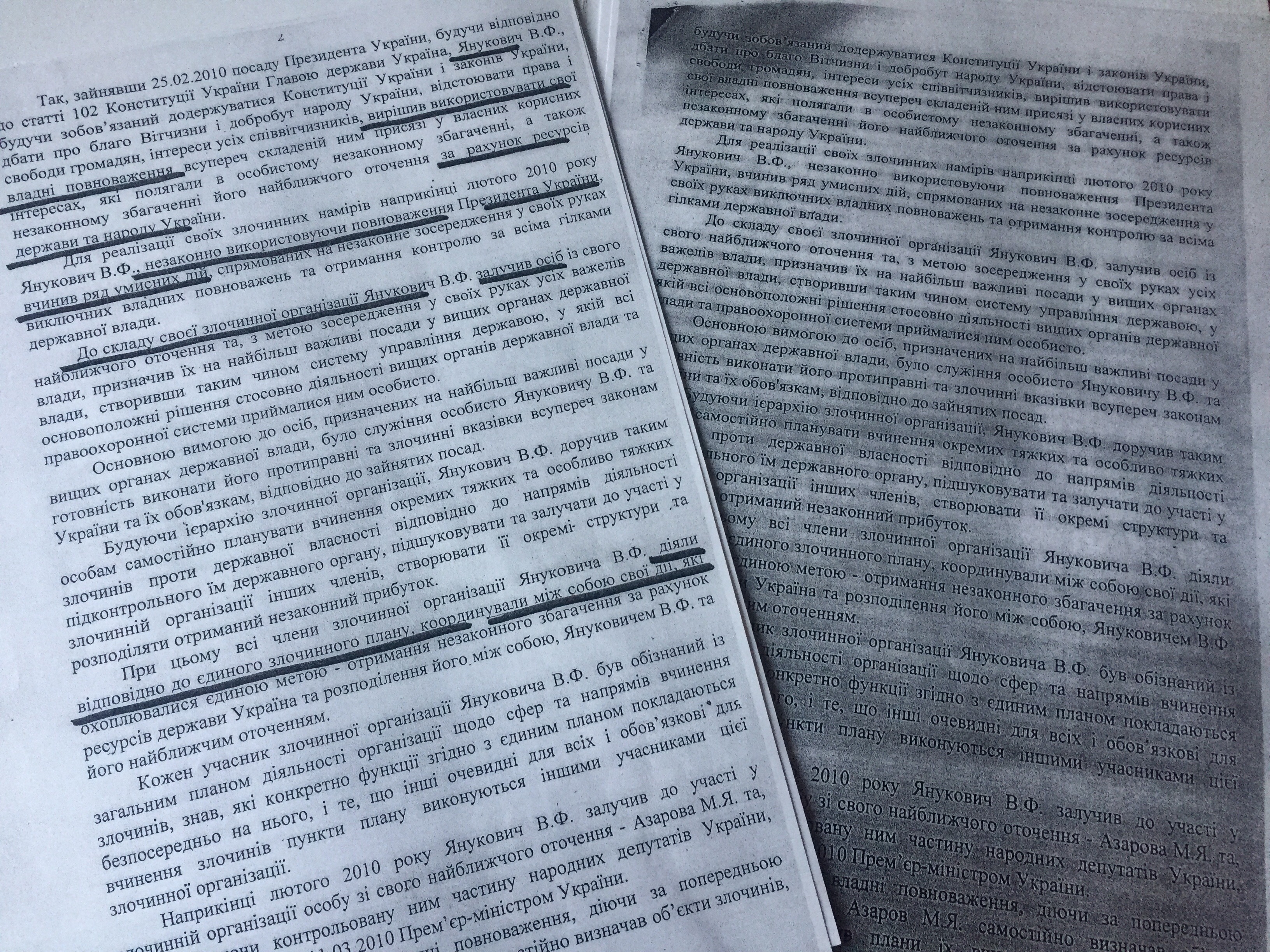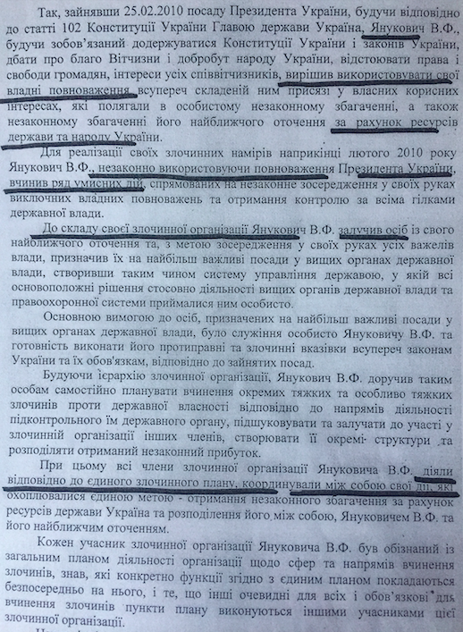 "Заняв 25.02.2010 года должность президента Украины, став соответственно со статьей 102 Конституции Украины Главой государства Украина, Янукович В.Ф., обязуясь придерживаться Конституции Украины и законов Украины, отстаивать права и свободы граждан, интересы всех соотечественников, решил использовать свои властные полномочия вопреки присяге, в собственных корыстных целях, которые состояли в личном незаконном обогащении, а также незаконном обогащении его ближайшего окружения за счет ресурсов государства и народа Украины... В состав своей преступной организации Янукович В.Ф. привлек лиц из своего ближайшего окружения, и, с целью сосредоточения в своих руках всех рычагов власти, назначил их на самые важные должности в высших органах государственной власти, создав таким образом систему управления государством, в которой все основополагающие решения относительно деятельности высших органов власти и правоохранительной системы принимались ним лично".