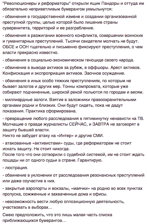 А вот экс-министр юстиции Елена Лукаш на своей странице в Facebook пишет, что какими бы не были краткосрочные результаты этих уголовных дел, впоследствии они вернутся бумерангом к тем, кто их использует сегодня.