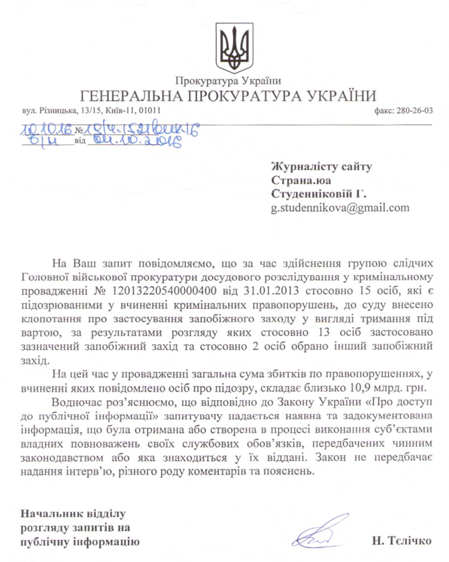 Отметим, что если верить этому ответу и материалам многочисленных ходатайств, которые есть в распоряжении "Страны", это дело было возбуждено 31.01.2013 - в разгар правления Виктора Януковича. То есть, получается, что Виктор Федорович сам себя "короновал" руководителем преступной организации и приказал возбудить против самого же себя уголовное дело. Возможно, это ошибка, а само дело было возбуждено после Майдана. Либо, как вариант, в прокуратуре взяли какое-то уголовное производство, возбужденное в начале 2013 года, и просто вставлены в качестве фигурантов новые фамилии. Но такой курьез с датами тоже весьма характерен.