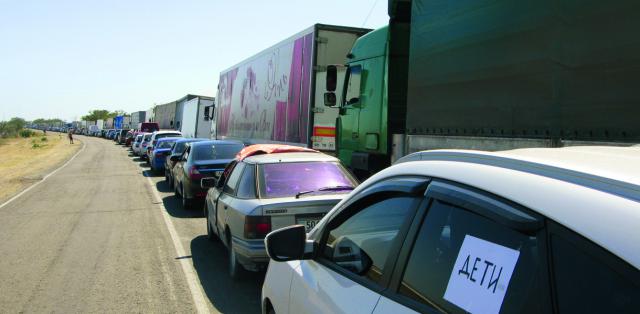 Вместе с замначальника отдела пограничной службы "Чонгар" майором Богданом Шахраем мы едем на служебной "Ниве Шевроле" вдоль очереди, которая кажется бесконечной. Потолок "Нивы" покрыт маленькими порезами — не больше пяти миллиметров длиной.