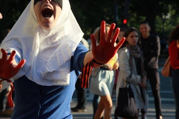 Облачившись в одежду российского триколора с повязкой на глазах, протягивая окровавленные руки к прохожим, перевязанные на запястьях георгиевскими лентами, она шла, издавая отчаянный крик на одной ноте.