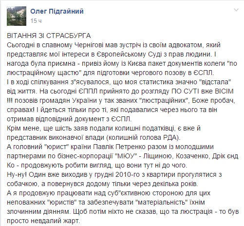 Пидгайный является первопроходцем среди надзорников Украины, которых уволили в рамках реализации закона "Об очищении власти", который вынес тяжбу за пределы страны. Не дожидаясь вынесения решения Конституционного суда по "люстрационному закону", он добился открытия производства по своему делу в ЕСПЧ.
