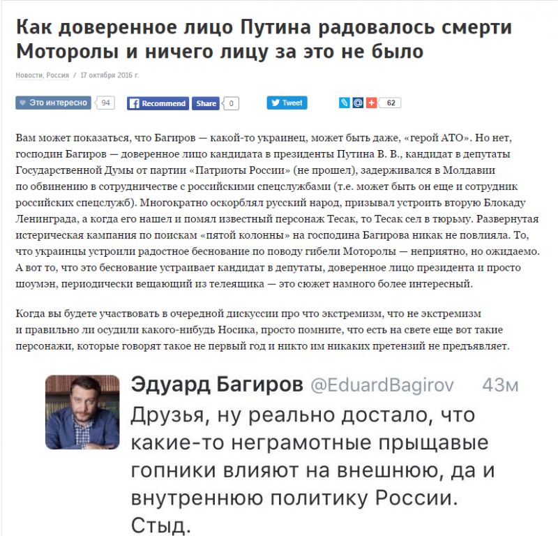 Чтоб вы понимали, что к чему. Просто реакция российских лидеров мнений и блоггеров, близких к Владиславу Суркову, на убийство Моторолы.