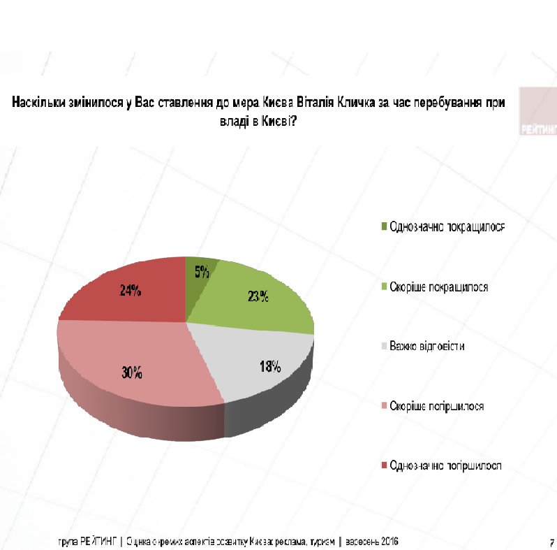 Стоит отметить, что согласно последних социологических опросов, обнародованных социологической группой “Рейтинг”, коррупция в органах городской власти с показателем в 36 % занимает вторую позицию среди проблем, которые больше всего беспокоят киевлян. Опережает среди проблем киевлян лишь вопрос тарифов. По мнению социологов, не в достаточной мере реагирование на проблемы киевлян, в том числе и на коррупцию, является главной причиной ухудшения отношение к деятельности Кличка. В частности у более половины киевлян (54 %), отношение к городскому главе ухудшилось. Рейтинг Кличко с 40,6 %, которые он получил во время выборов, снизился почти вдвое. Сегодня лишь 21,4 % киевлян были бы готовы проголосовать за Виталия Кличко.