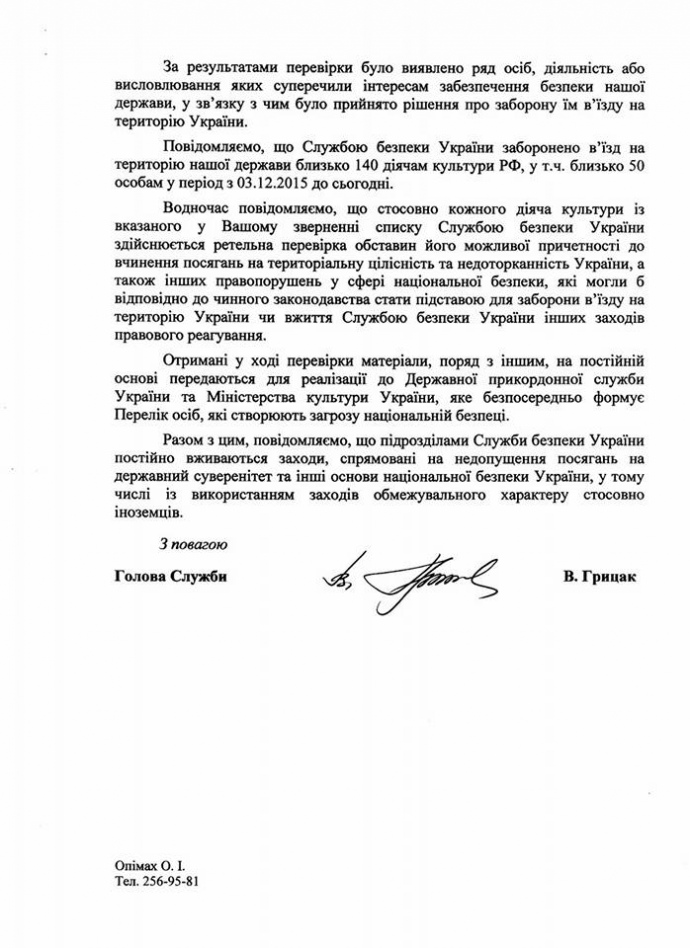 Служба безпеки України заборонила в’їзд в країну близько 140 російським діячам культури, в тому числі 50 з них - в період з 3 грудня 2015 року по 29 жовтня 2016 року.