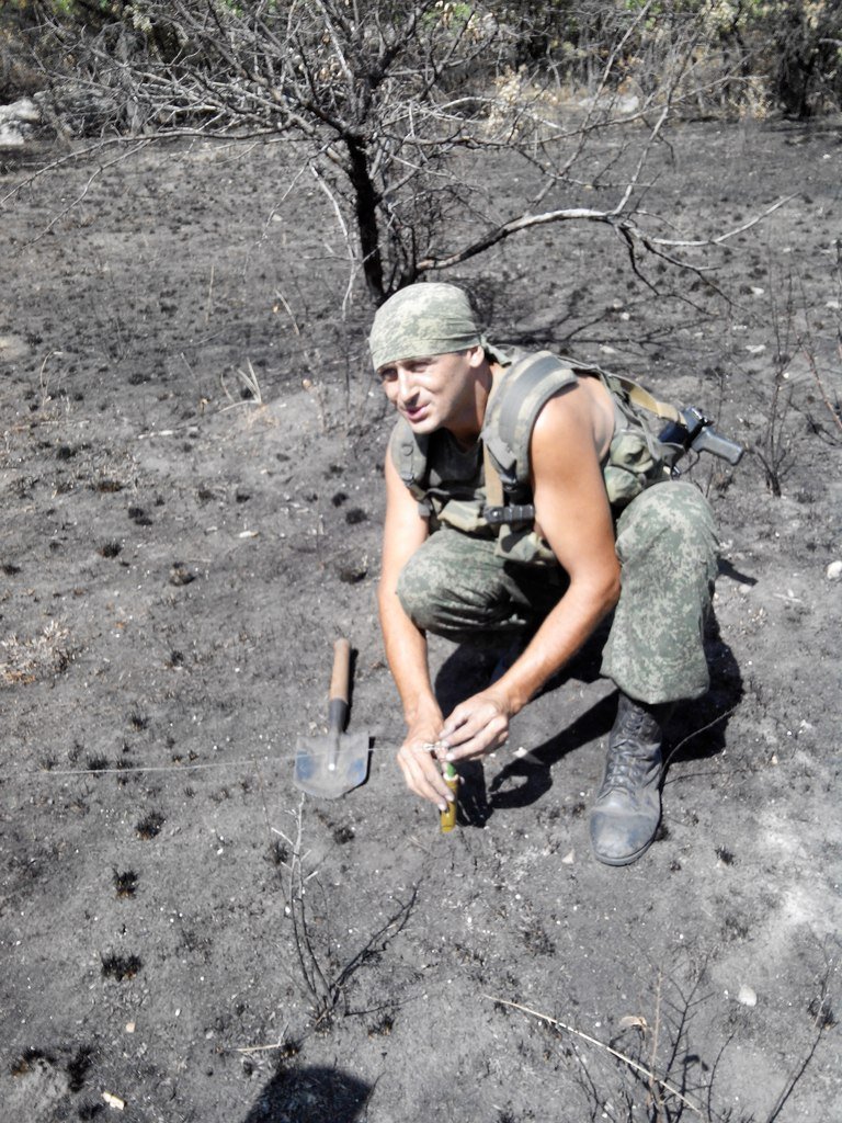 Тут он ставит растяжку на обгорелой земле, по которой видимо до этого лупили Градом: