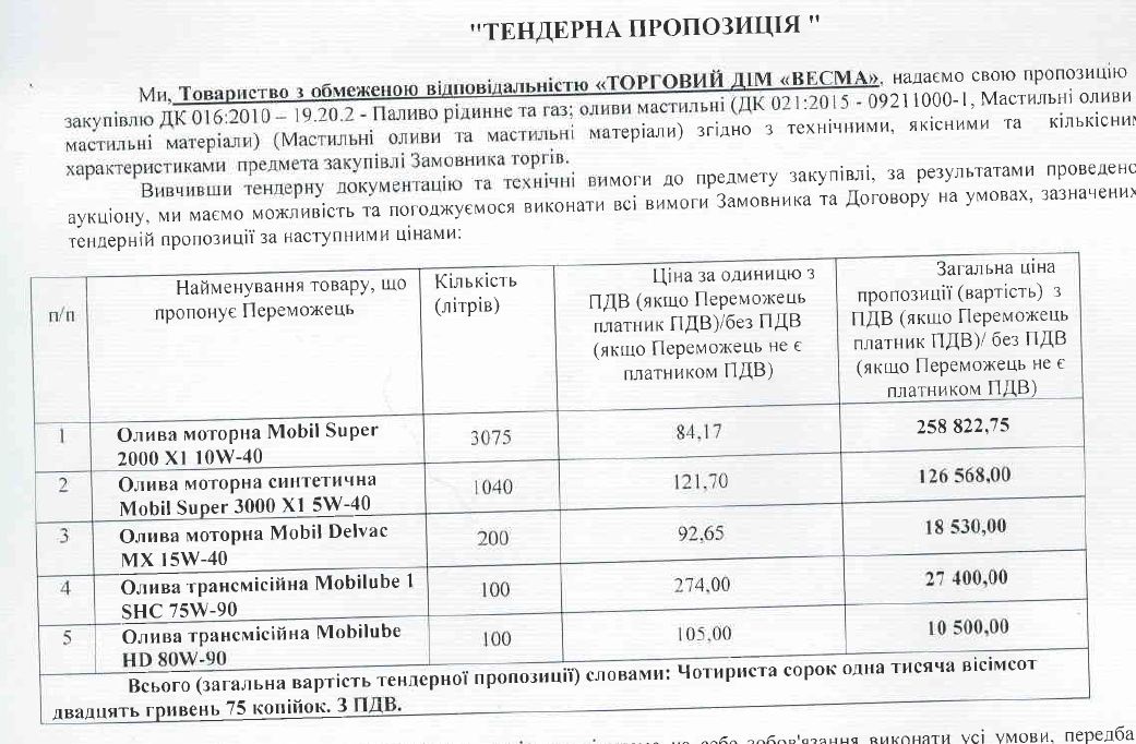 Отметим, что в техзадании на тендер было указано, что полиция желает приобрести масла марки Mobil или эквивалент. Отклоненные фирмы предлагали другие импортные масла, которые изготовлены в странах Евросоюза. ООО “ТД “Весма” предложила именно те марки, которые указывала полиция в техзадании.