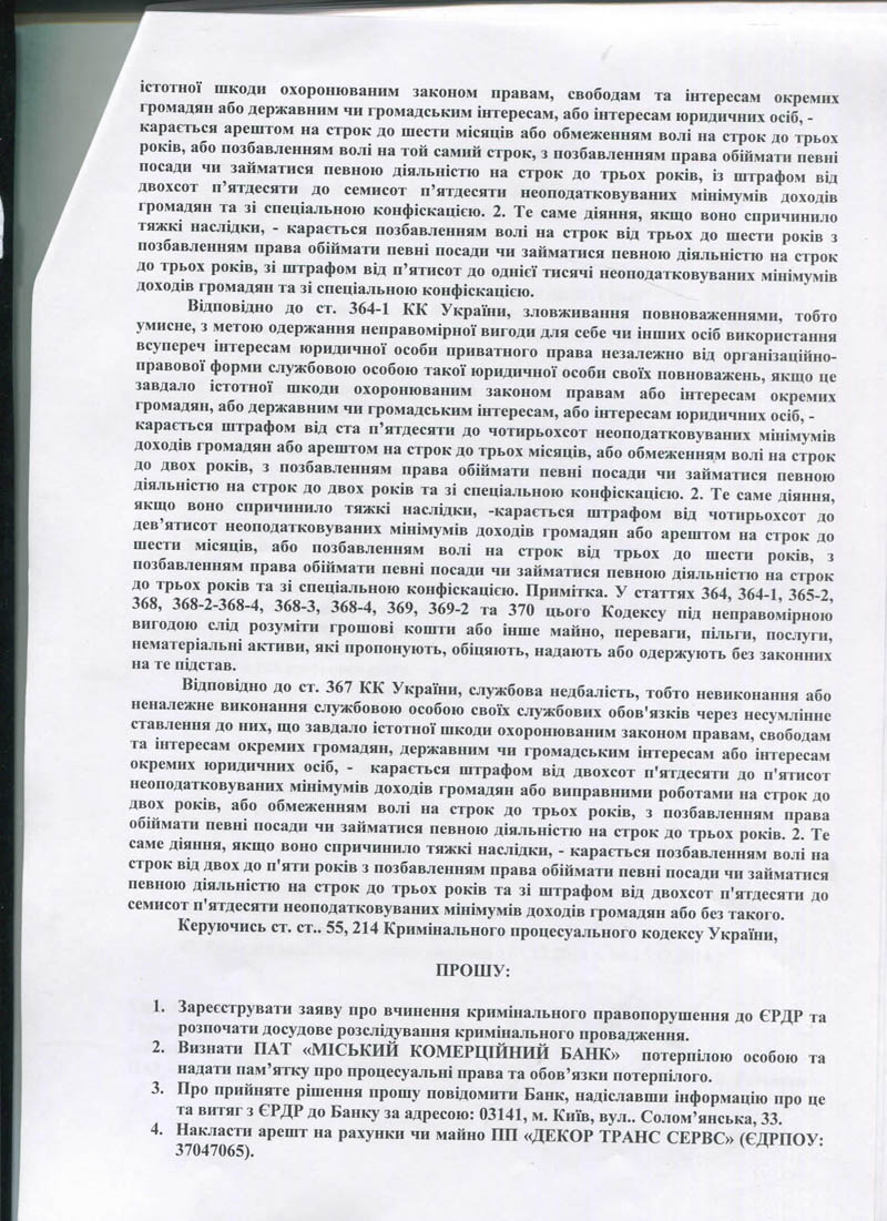 «30.06.2011 года между ПАО «Конверсбанк» (в дальнейшем переименован в ПАО «Городской коммерческий банк») в лице председателя правления Лебедева Вениамина Алексеевича и ПП «Декор Транс Сервис» (заемщик) в лице Директора Невроды Юрия Львовича подписан кредитный договор № 758/980-ЮО, в соответствии с условиями которого Банк предоставляет заемщику 9 365 000, 00 грн, начиная с 30.06.2011 года до 29.06.2012 года», — сказано в заявлении ликвидатора СитиКоммерсБанка на имя начальника ГУ МВД в г. Киеве Терещука от 18 декабря 2014 года. В этот же день, согласно документу, имеющемуся в распоряжении редакции, «Декор Транс Сервис» получает на счет все деньги кредитной линии на основании письменного распоряжения Лебедева.