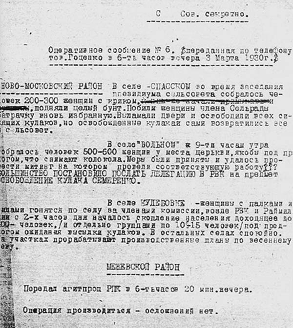 «Масові заворушення зазвичай розпочиналися з того, що натовпи жінок у 200-300 осіб, а іноді і значно більше, збиралися біля сільрад з вимогами виходів з колгоспів, видачі зерна і усуспільненого майна», — відзначав голова ГПУ УСРР Всеволод Балицький у доповідній записці генеральному секретарю ЦК КП(б)У Станіславу Косіору, аналізуючи причини та хід селянських виступів у прикордонних округах України наприкінці березня 1930 року.