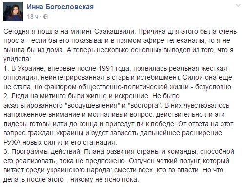 - В Украине, впервые после 1991 года, появилась реальная жесткая оппозиция, неинтегрированная в старый истебишмент. Силой она еще не стала, но фактором общественно-политической жизни - безусловно. Люди на митинге были живые и искренние. Не было экзальтированного "воодушевления" и "восторга". В них чувствовалось напряженное внимание и молчаливый вопрос: действительно ли эти лидеры готовы идти до конца и приведут ли к победе, - нахваливала на своей страничке "Фейсбук" команду Саакашвили Инна Богословская.