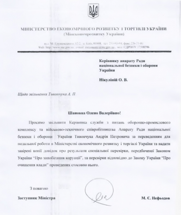 Щоб уникнути відкритого конкурсу в міністерстві, Тивончука спочатку роблять переможцем іншого, закритого конкурсу в РНБО – на посаду керівника служби з питань ОПК, яка займається підготовкою матеріалів для Гладковського. "Покерувавши" цією службою офіційно тиждень, Тивончук переходить у МЕРТ на посаду директора департаменту.