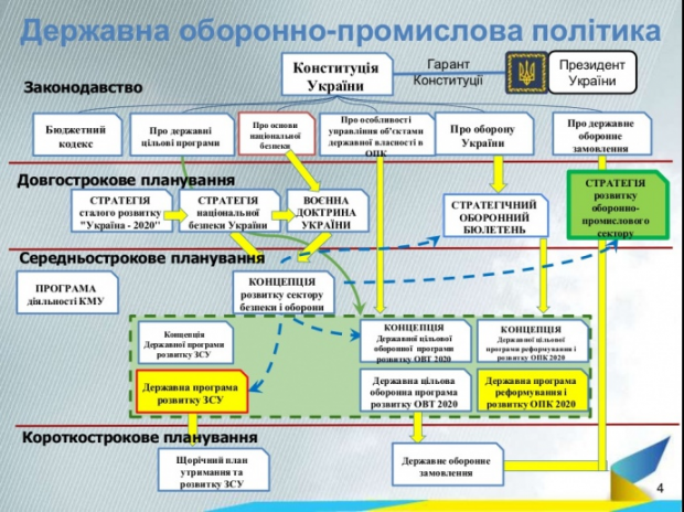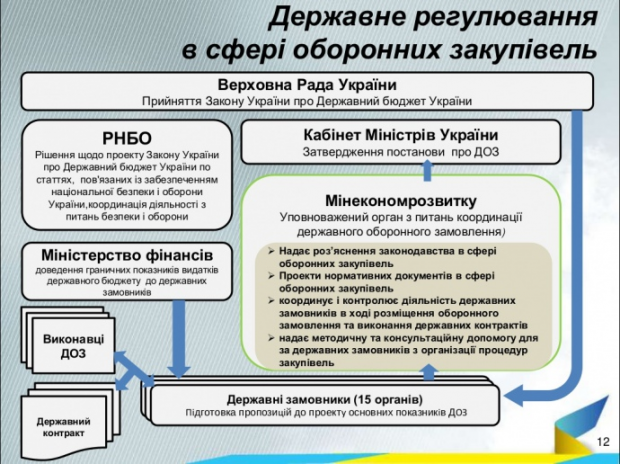 ВР затверджує річний держбюджет. Кожному центральному органу влади визначається свій бюджет: наприклад, у Міноборони 60 мільярдів гривень. Цей бюджет ділиться на всі потреби – на зарплати, житло, закупівля речей та військової техніки. Закупівля військової техніки проходить через державне оборонне замовлення (ДОЗ), на якому стоїть гриф цілком таємно. Усі пропозиції до ДОЗ подаються в МЕРТ, яке готує їх до затвердження кабміном. Перед затвердженням урядом проект ДОЗу розглядається РНБО. Після затвердження кабміном ДОЗ виконуються.