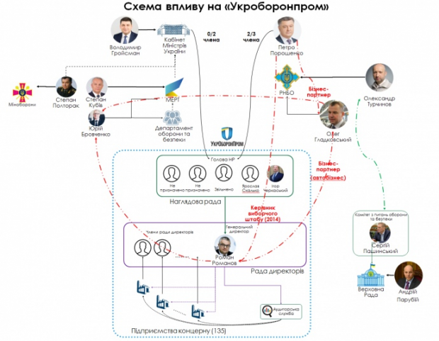 Донедавна в оборонці існував певний статус-кво. Сфери впливу були поділені між секретарем РНБО Олександром Турчиновим та Петром Порошенком. Президент здійснював контроль через 1-го заступника Секретаря РНБО Олега Гладковського, який є давнім бізнес-партнером Порошенка та інститутським товаришем нардепа з БПП Ігоря Кононенка. Нещодавно програма журналістських розслідувань "Схеми" виявила, що ці троє мають вілли по сусідству на узбережжі Іспанії.