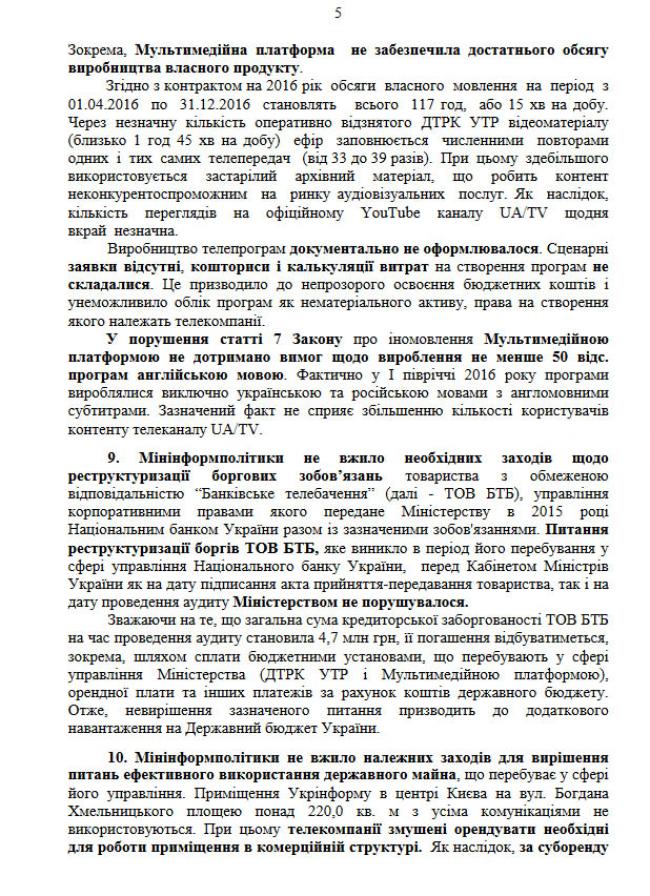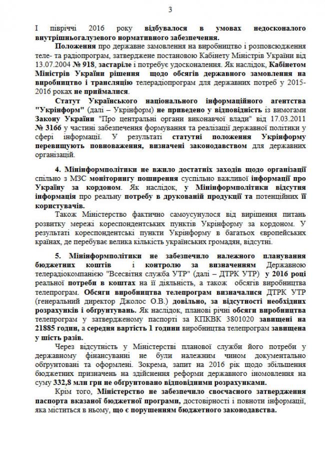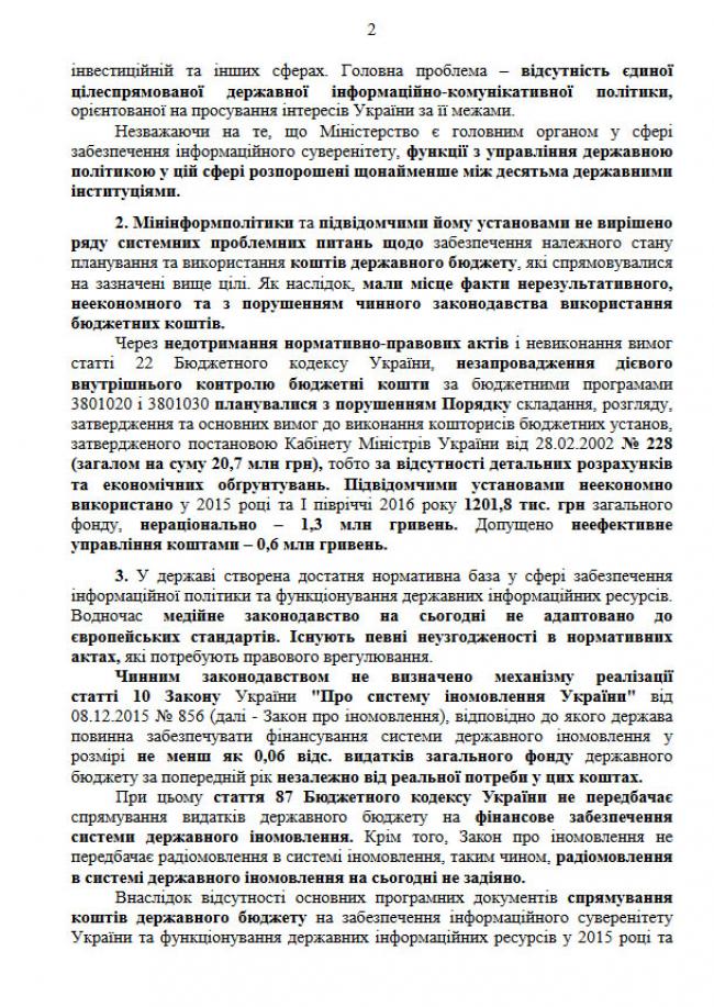 - отчего это происходит? Одна из причин, как выяснила Счетная палата, в том, что даже те немногие средства, которые Украина тратит на информполитику, используются неэффективно. Так, в деятельности МИП обнаружены «факты нерезультативного, неэкономного и с нарушением действующего законодательства использование бюджетных средств». В частности, бесконтрольность и отсутствие экономического обоснования в реализуемых проектах привело к «неэкономному использованию» в 2015 и первом полугодии 2016 г 1 млн 208,1 тыс грн; «нерациональному использованию» 1,3 млн грн, «неэффективному управлению средствами» на 0,6 млн грн.