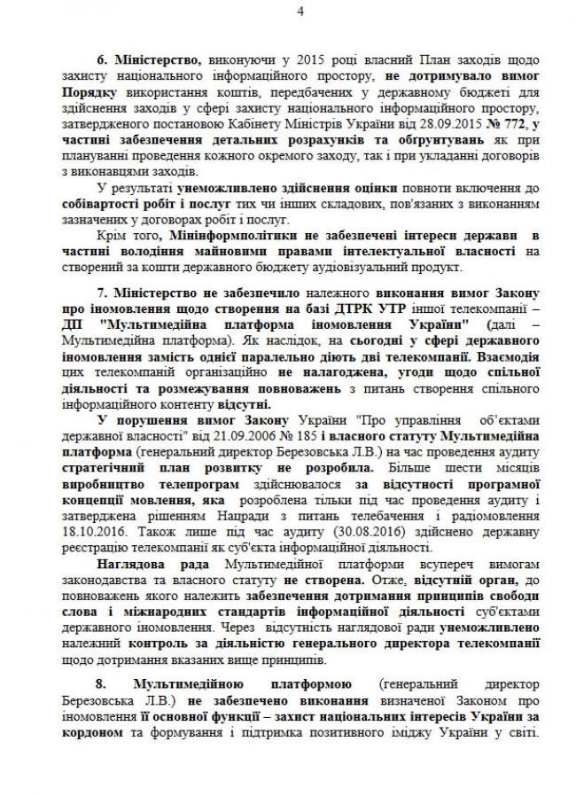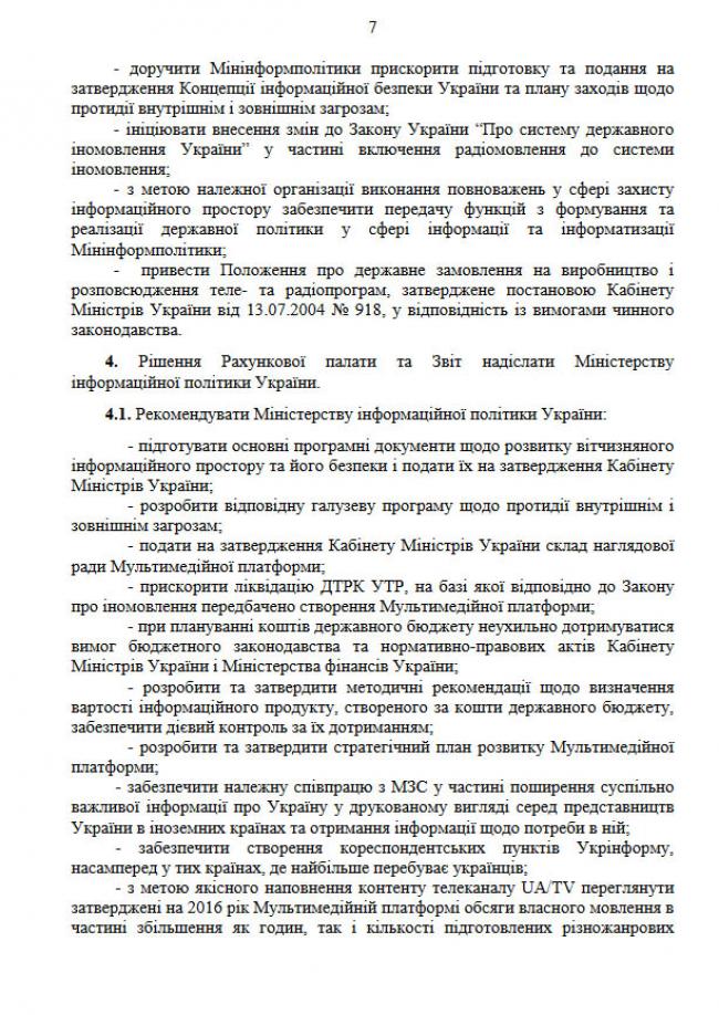- и, наконец, самое главное. В отчете указан общеизвестный факт: за годы агрессии РФ у Украины так и не появилось стратегических документов в сфере информационной политики. Т.е. в МИП какие-то писульки насочиняли в виде проектов, но на сегодня они так и остаются темой для пиара, но не действующими документами. И сразу же отвечаем чиновникам МИП на их предвидящиеся возражения, что, мол, они писали-писали, а «наверху» их опусы не утверждают: если эти проекты документов действительно имеют право на жизнь, надо за них бороться и объяснять стране, кто конкретно «тормозит» принятие столь важных решений, но ни одного подобного заявления от руководства МИП мы за 2 года не слышали. Плюс МИП имеет «представительство» непосредственно и в Кабмине, и в СНБО, так что все карты на руках.