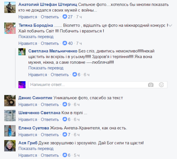 "Жена генерал-майора. Героя Украины. Всегда за спиной. Выходила мужа. Вынянчила. И сейчас всегда рядом, всегда за спиной. Самая надежная опора. Не подведет. Не отойдет. Пример веры, любви, преданности, упорства и силы. В этом кадре -- все ее отношение, вся она. Быть рядом и не быть в кадре. Держать незаметно. Преклоняюсь. Вот кто -- настоящий Ангел -Хранитель Игоря Гордийчука.", - написала вона.