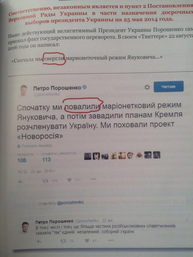 З опублікованої фотографії випливає, що у твіті, який був розміщений на офіційному Twitter-акаунті президента України від 22 серпня 2016, Петро Порошенко нібито визнає вчинення державного перевороту. В матеріалах справи Петро Порошенко вказаний як нелегітимний президент України, а рішення Верховної Ради України про проведення 25 травня 2014 року президентських виборів незаконним.