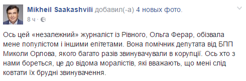 При этом сам Саакашвили оправдал свое поведение тем, что Ферар является помощником депутата от БПП Николая Орлова, которого якобы многократно уличали в коррупции.