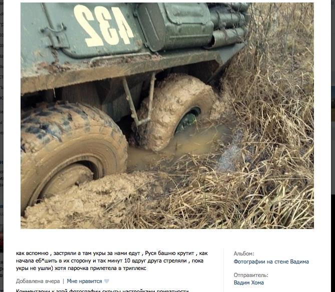 А вот БТР Хомы/Мирзаева с номером 432 и комментарий: "как вспомню , застряли а там укры за нами едут , Руся башню крутит , как начала еб*шить в их сторону и так минут 10 вдруг друга стреляли, пока укры не ушли) хотя парочка прилетела в триплекс"