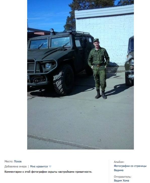 Вот Вадим Хома, 23 года из Пскова. Он недавно вернулся из Украины, о чем сообщил своим читателям: "дома!!!)"