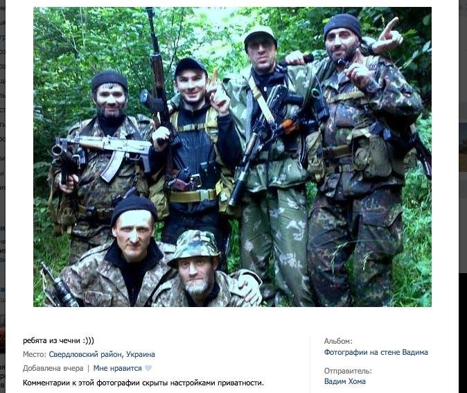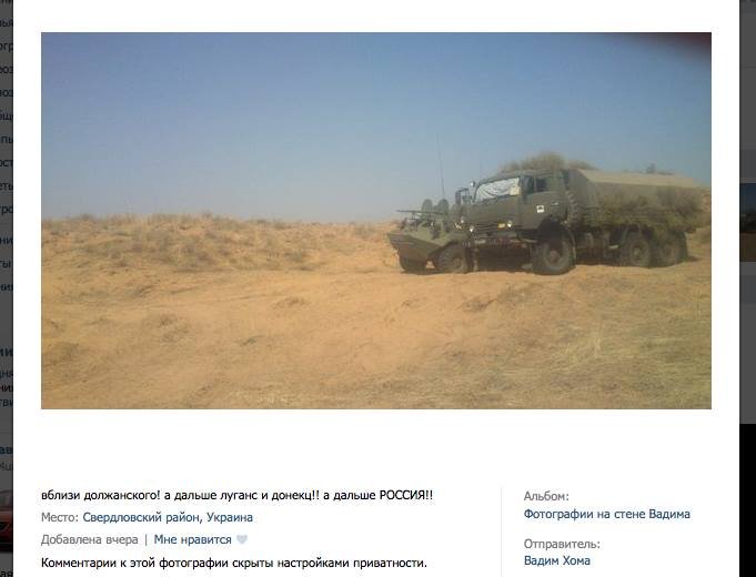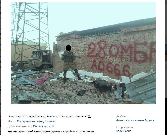 Вот дальше на фоне отбитого у украинской 28-й ОМБР населенного пункта: "давно еще фотграфировался , наконец то интернет появился :)))"