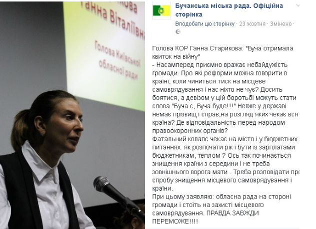 Также Старикова приезжала в поддержку Федорука в Бучу и участвовала в так называемых собраниях общины в кинотеатре «Аквариус».