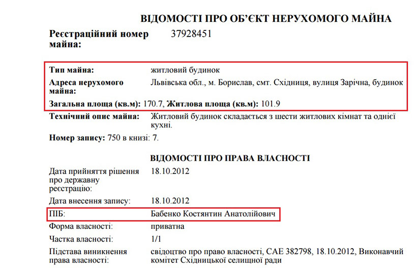 — 1 участок в Трускавце, во Львовской области, на котором, очевидно, и находится то единственное жилье, что находится в собственности гр. Бабенко — дом на 170 кв.м.