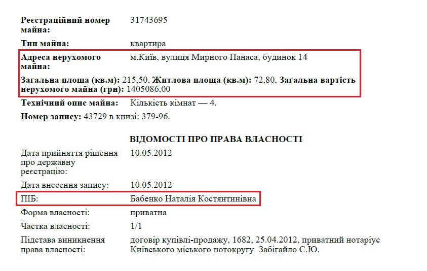 Не менее интересным оказалось и имущественное положении семьи судьи. Лучше прочих обеспечена жильем 20-летняя дочь судьи — Бабенко Наталья Константиновна. Так в возрасте 16-ти лет она стала обладательницей огромной квартиры на Печерске площадью 215 м2.