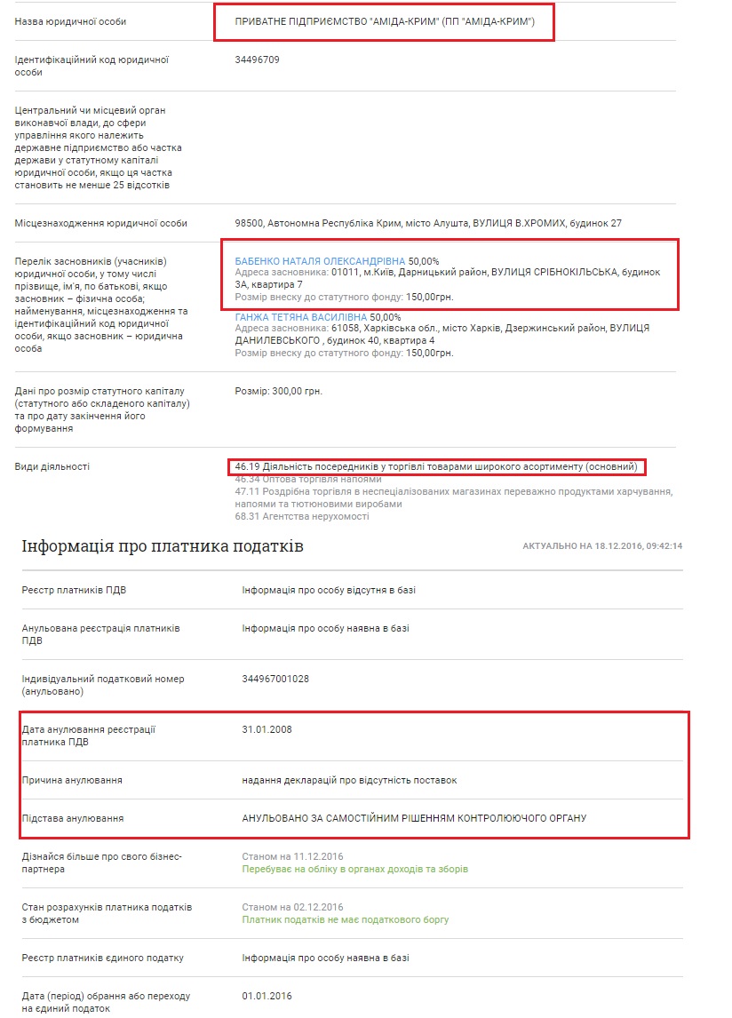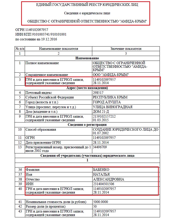 За 2,5 года с момента оккупации Крыма супруги Бабенко так и не решили перерегистрировать предприятие в Украине. До сих пор юридическим адресом компании является именно Алушта. Но определенные изменения в регистрации таки состоялись. Согласно данным российского реестра, данное предприятие 24.11.14 г. было зарегистрировано по законодательству России. И там оно уже не частное предприятие, а Общество с ограниченной ответственностью, и юридический адрес уже иной. Интересно, какая именно информация является достоверной? Почему жена Бабенко решила не перерегистрировать предприятие в Украине и куда уплачиваются налоги от такой деятельности?