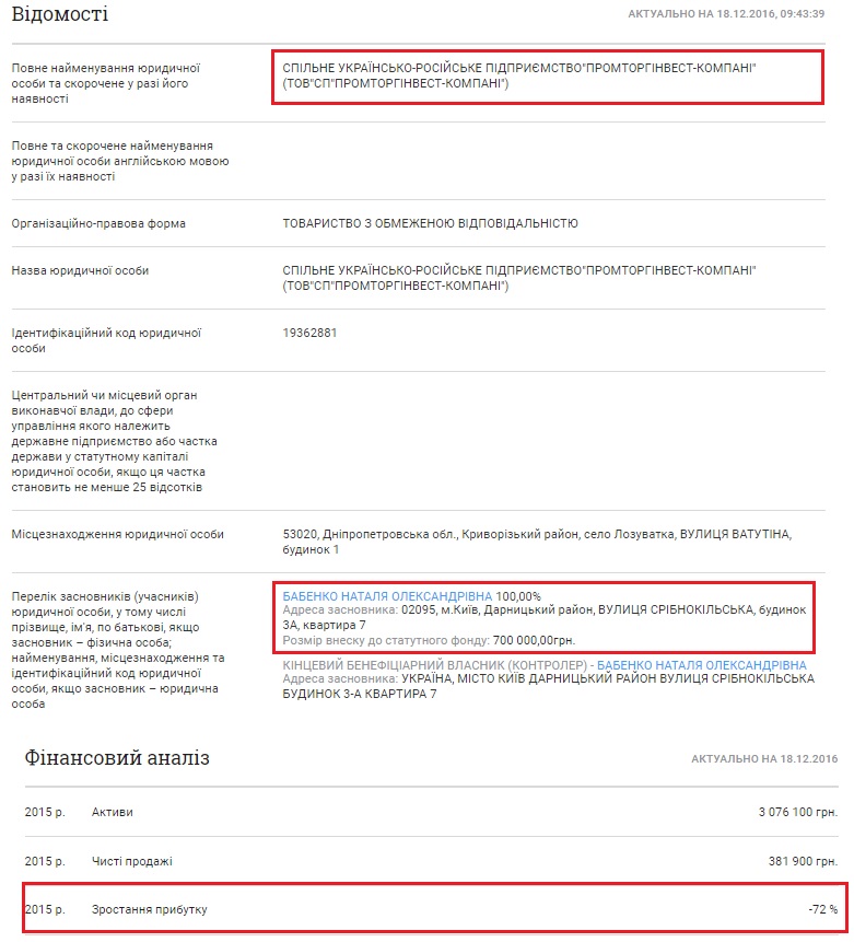 Другой компанией, бенефициаром которой значится жена судьи Бабенко, есть совместное украино-российское предприятие «Промторгинвест-Компани», которое занимается деятельностью в сфере проводной электросвязи. Уставный капитал этой компании значительно больше и составляет 700 тыс. Впрочем, согласно налоговых отчетов, последние годы доход компании не впечатляет. Так в 2015 году доход компании уменьшился на 72%.