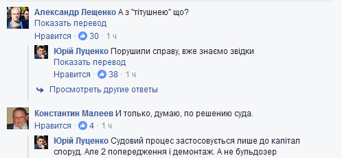 Генеральный прокурор Украины Юрий Луценко подчеркнул, что даже незаконные малые архитектурные формы и временные сооружения можно сносить только после предупреждения.